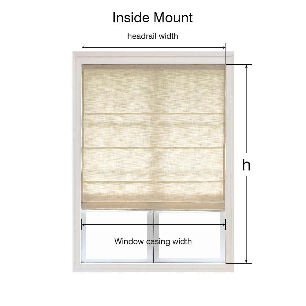 • Measure the inside width of the window at three points: the top, middle, and bottom. Use the smallest one and round down to the nearest 1/8 inch, then deduct 3/8 inch. That will be your Roman shades width.