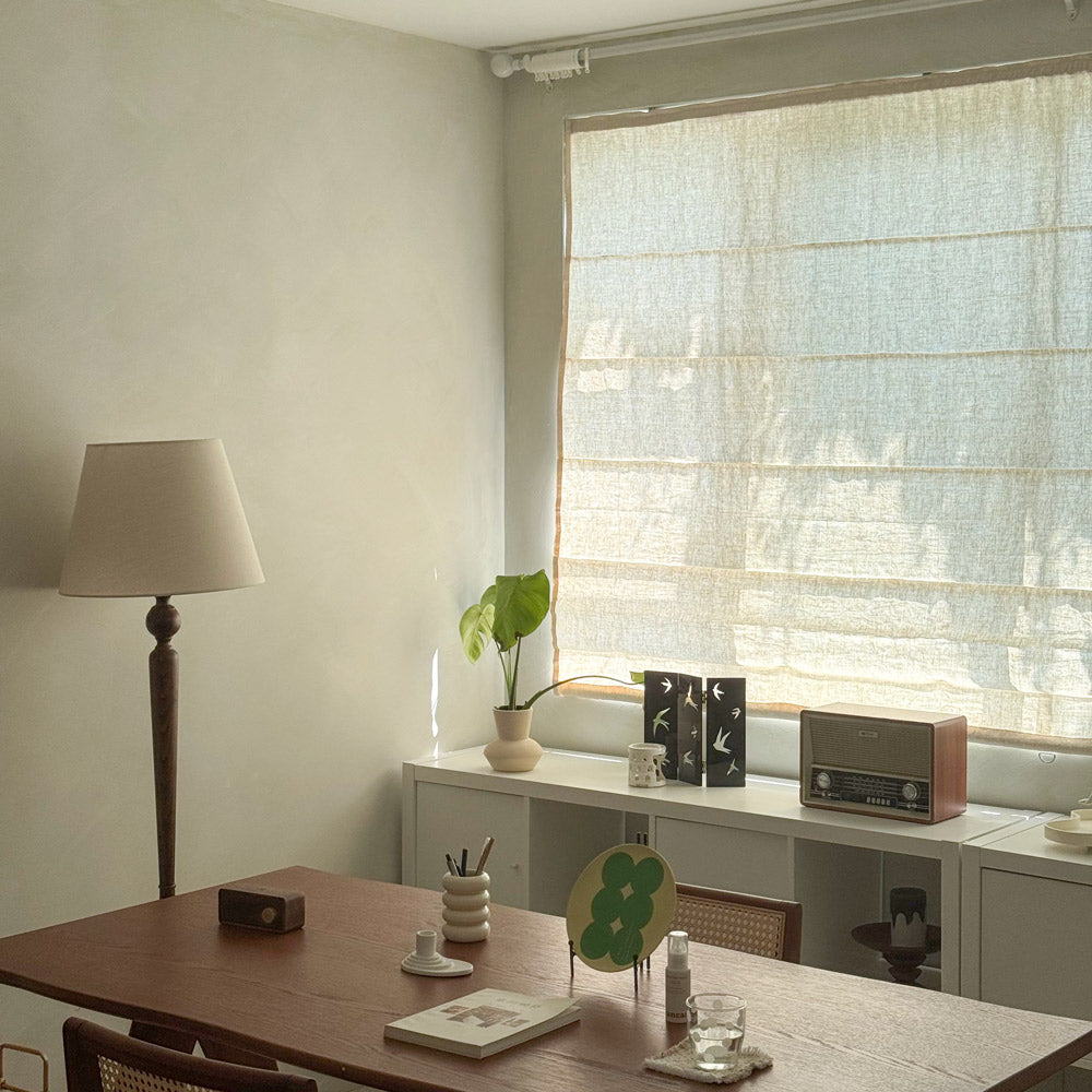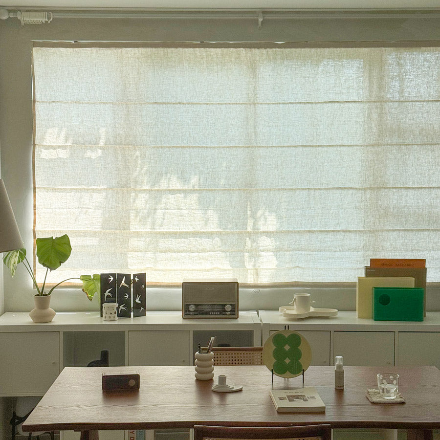 Unlike drapes, our linen Roman shades fold into neat, soft pleats when raised, offering a clean, tailored stack.