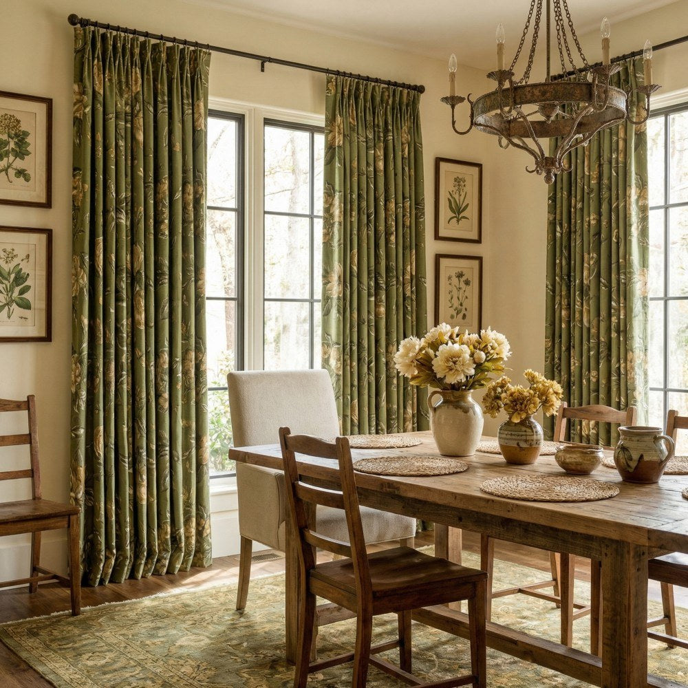 Muted olive green hues with botanical pattern, our Cheyenne floral curtains exude freshness and lively ambiance, full of charming farmhouse style.