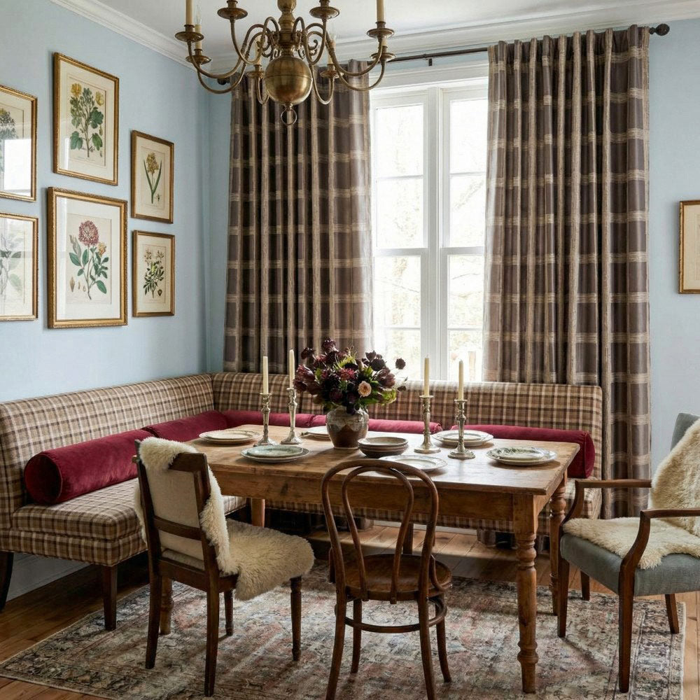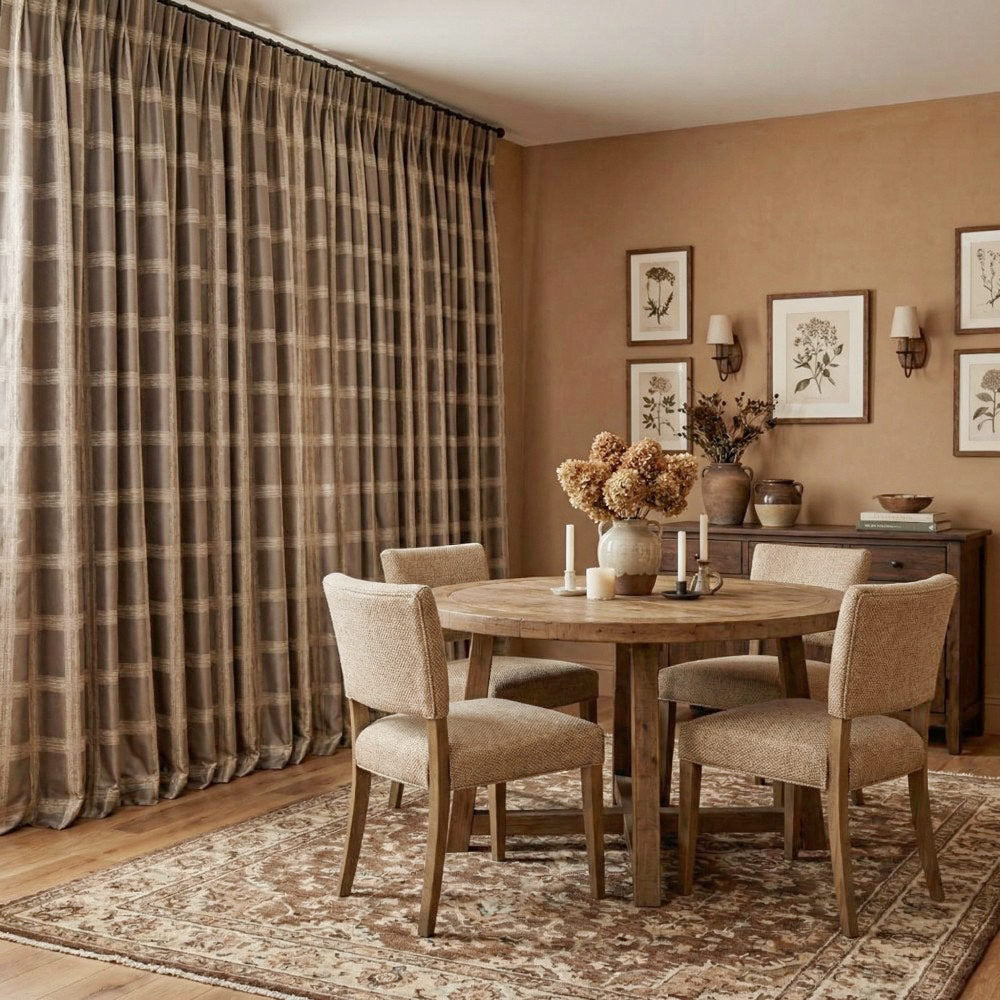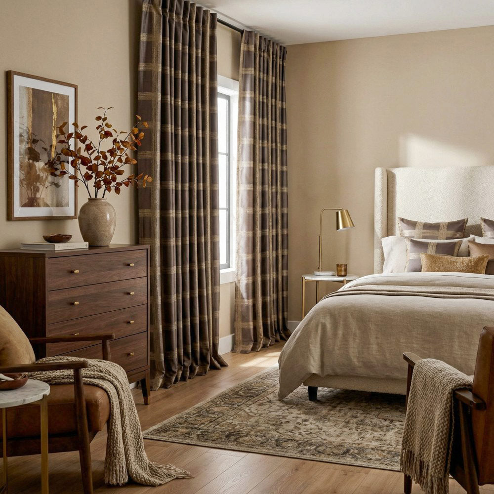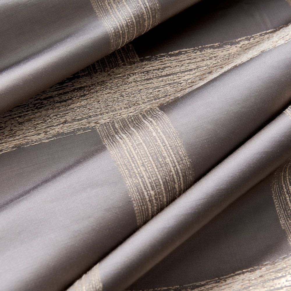 Gold threads are interwoven into dark brown fabric, creating a gold foil plaid patterns, clean and crisp. It adds a urban style to this curtains.