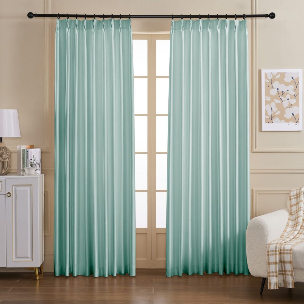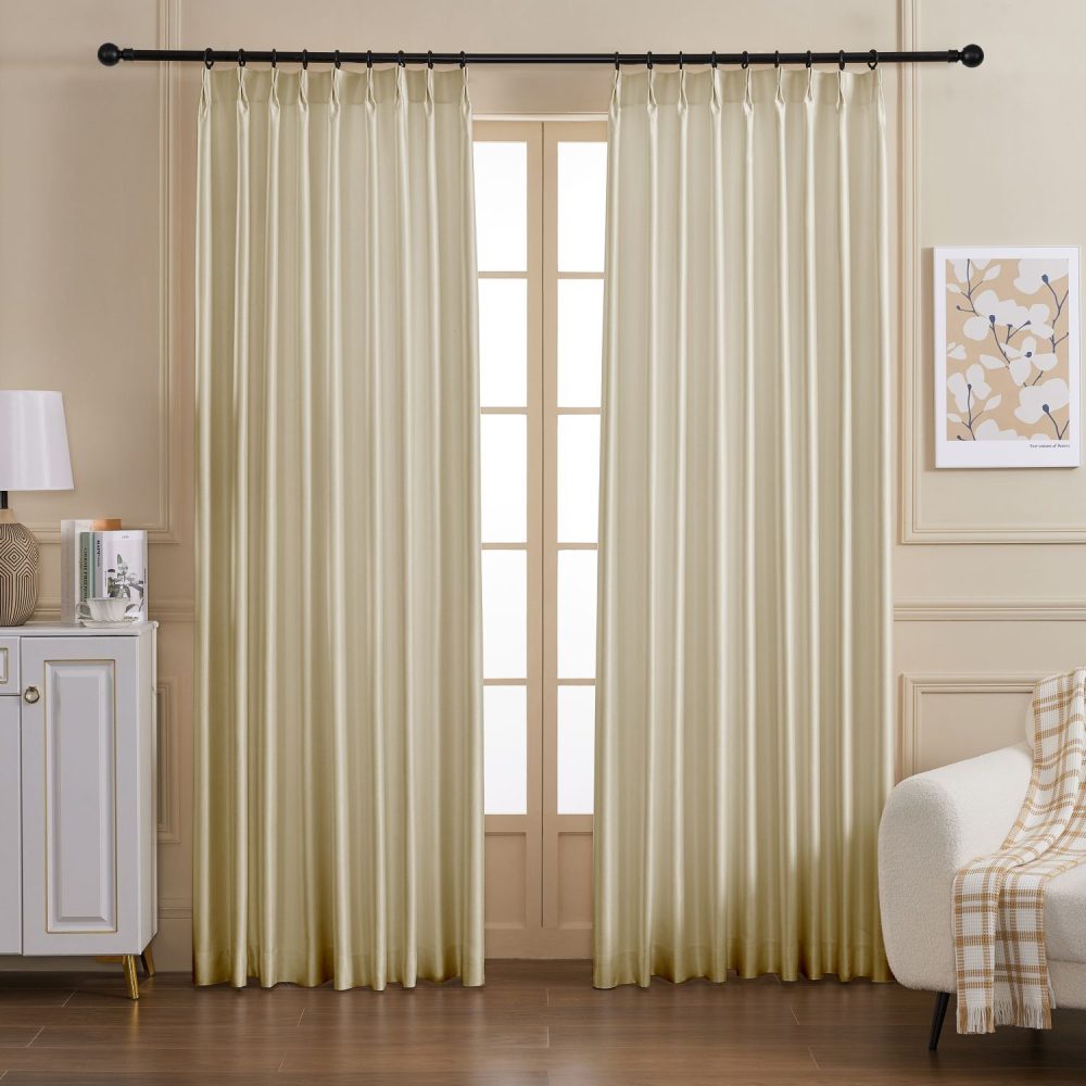 For double/triple pinch pleat curtains, the recommended width is 1x of the curtain rod/track. And measure the length from the ring where the curtain hooks/clips are attached. (the “Width of Curtain” refers to the width after pleats-made for plteated curtains)