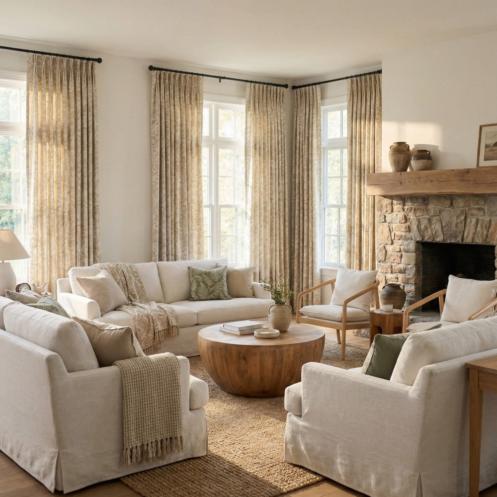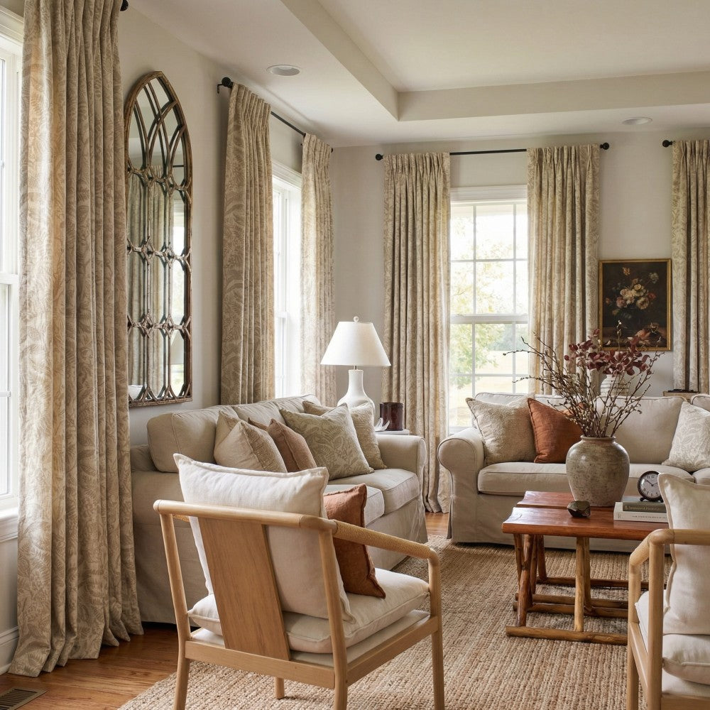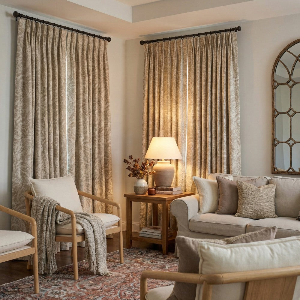 With beige hues and intricate botanical design, the Oakley curtains add coziness and calm to your home, creating a farmhouse style.