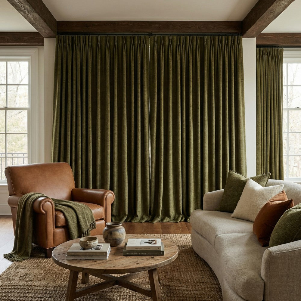 1. For solid curtains like linen curtains, the maximum finished curtain width without a seam is 104 inches(for pinch pleated curtains, it’s 52 inches) for curtain lengths above 104 inches. For curtain lengths below 104 inches, there is no seam and no limits on the width.