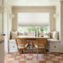 Pinstripes, linen fabric, make these Roman shades ideal for creating a relaxed, rustic ambiance.